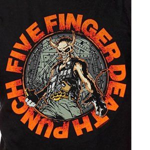 Black T-shirt from Five Finger Death Punch circular logo and devil design. 100% Pre-Shrunk Heavy Cotton.