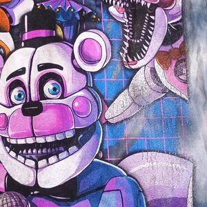 Preowned Five Nights at Freddy’s kids size Large graphic T-shirt featuring a bold Sister Location design. Shirt has a stylish black and grey tie-dye pattern and short sleeves. Perfect for FNAF fans, gamers, and collectors. Soft, comfortable, and great for everyday wear.