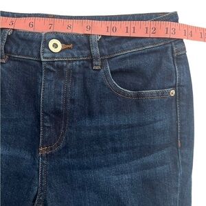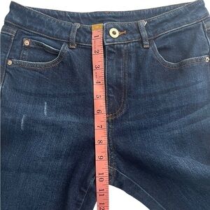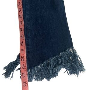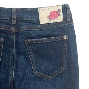 Five Plus Juniors Distressed Raw Hem Cropped Jeans. Size Small. Dark blue wash denim with distressing. Raw frayed ankle hems. Classic 5 pocket design. Zip fly and single button closure. Approximate measurements as pictured. Cotton blend fabric with stretch. Good condition. Like new.