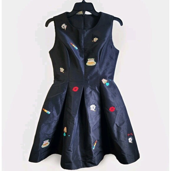 Make a bold and playful statement with this rare Five Plus dress featuring iconic Betty Boop embroidery and fun birthday-themed patches! This fit-and-flare black dress combines a flattering silhouette with quirky, colorful details like cakes, kisses, lipstick, and more.