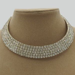 Thick choker necklace of 5 rows of round prong-set clear rhinestones. The back of the necklace is secured with a chain and lobster clasp.