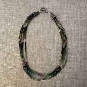 Gorgeous Tourmaline Gemstone Necklace with sterling toggle clasp closure. Multicolor tubular shaped tourmalines in shades of greens, pink and touches of blue. Beautiful. 18" length. Beautiful quality gemstones.