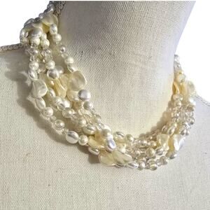 This five-strand beaded necklace features creamy off-white imitation pearls, adding an elegant touch with its acrylic construction. Perfect for vintage enthusiasts, this 16" choker includes a silver-tone push lock clasp.