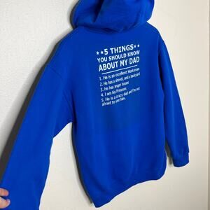 Five Things to Know about My Dad Blue Hoodie Small. Cute hoodie with list of 5 things to know about my dad. Basic blue hoodie with print on back. Please see all photos. Approx measurements in pictures.