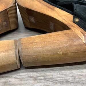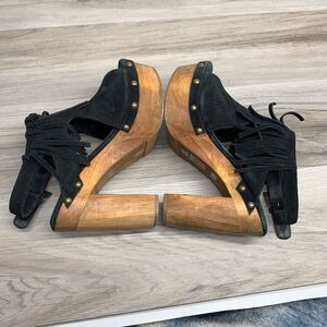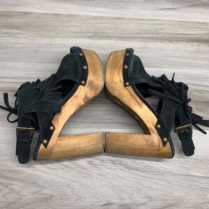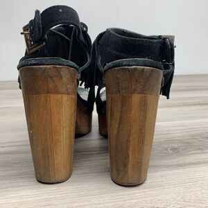 Five Worlds Platform Heel Sandal Black 37 7 Suede Fringe Wood Boho Ankle Strap
