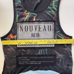Black muscle tank with large, large armholes. Scoop neck and curved hemline. Could be unisex sizing. Tropical print behind the applique. In excellent condition!