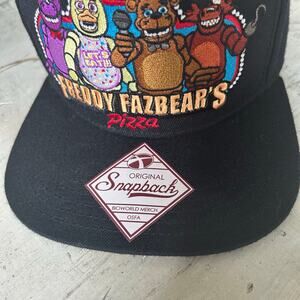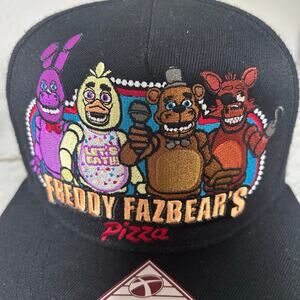 New Five nights at Freddy’s black embroidered hat with group of bear characters. Wide brim inside brim has graphics. Adjustable SnapBack