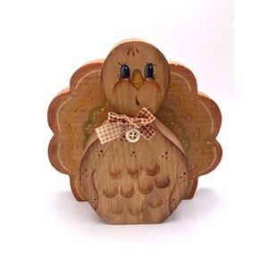 2nd picture. Turkey is approx 12.5” tall and approx 8.5 at widest part. Can stand or hang. Writing on back.