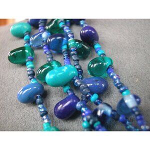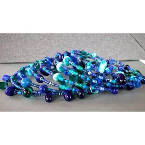 This jewelry set features vibrant blue and turquoise glass beads, offering an elegant and versatile accessory for various occasions. Thoughtfully designed for durability and style, it includes a multi-strand necklace, stretch bracelet, and matching earrings.