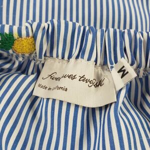 Fiveloaves Twofish Pineapple Catalina Dress.Blue and white stripes with embroidered pineapples and yellow tassel trim. The dress underneath is a tank style dress with the elastic topper that can be worn on or off shoulder. Light cotton fabric