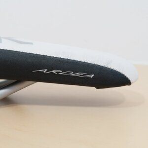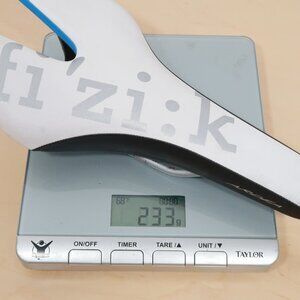 Fizik Ardea saddle in a white/black/blue color. Weighing 233 grams, this is a nice light saddle for road/cross/gravel riding with manganese rails. This has seen very little use, and is in excellent preowned condition.
