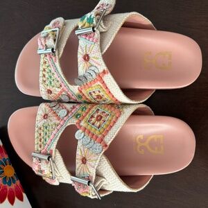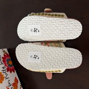 Upper: Multi-coloured thread embroidery on a cream matte base
