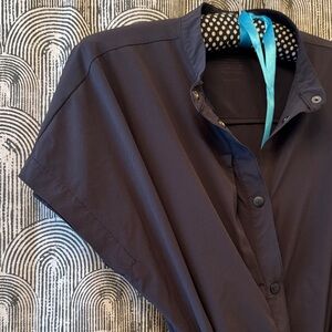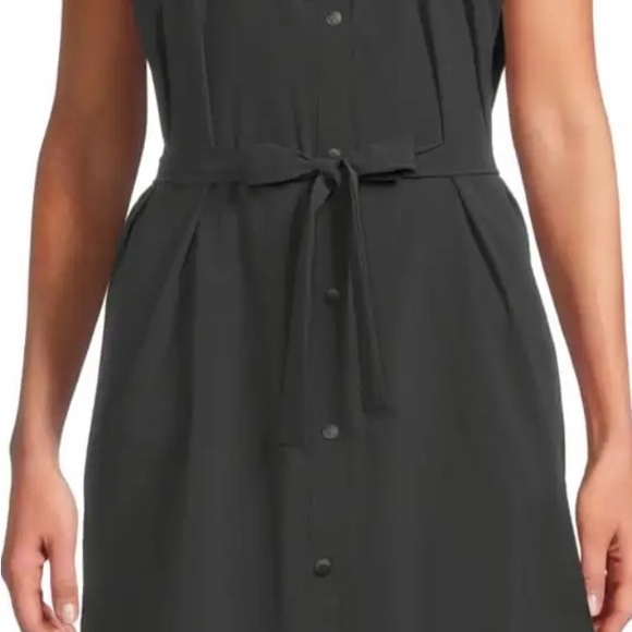 Chic black sleeveless dress with button-up front and waist tie. A casual layer or look for any occasion.