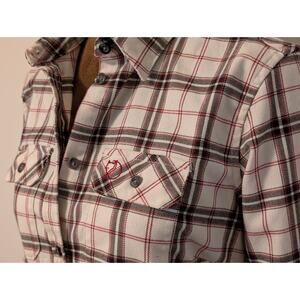 Worn only a few times, near perfect condition. Nice, thick cream, brown and red plaid flannel material with a comfy stretch to it.