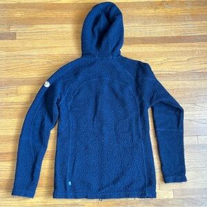 Fjallraven Kaitum fleece, navy, women’s S. Excellent used condition. Cozy wool/poly blend. Somewhat slim fit. Sleek silhouette with double zipper for more hip room. Zippered handwarmer pockets and internal stash pockets.
