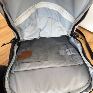 Some signs of use inside (orange stain on inside pocket, pen marks; see photos). May be able to get out with some stain remover, I have not tried :-P