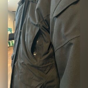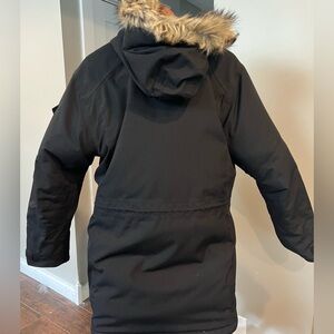The coat is generously sized and very warm with reinforced elbows and tons of pockets. It’s made from durable, recycled polyamide with waterproof and breathable membrane, has an adjustable storm hood with protective brim and detachable faux fur edging. It has a two-way front zipper with placket and snaps, drawcord adjustment at the waist, and Velcro adjustments on the cuffs.