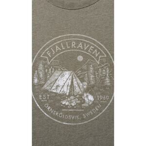 This Fjällräven Lagerplats T-Shirt in size Medium features an outdoor-inspired campsite graphic with mountains, trees, and a tent. Designed for nature lovers, it celebrates the brand's heritage from Örnsköldsvik, Sweden, est. 1960.