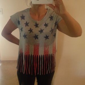 Great for all the patriotic holidays! Heather gray cap sleeve tee with navy blue stars and red stripes on fringe. Size medium can also fit a small. Only worn once, perfect condition.