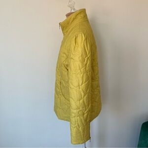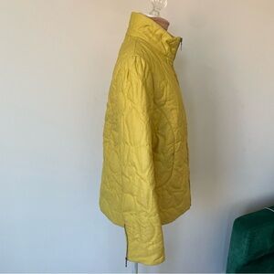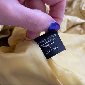 Bold mustard yellow jacket with interesting details - curved zip pockets, zips at cuffs, and a free-flow abstract embossed quilted pattern. Fabric has a slight sheen to it and jacket is nicely tailored to accent the waist. In great pre-owned condition, and works well dressed up (for example, black velvet wide leg pants) or down (maybe your favorite acid washed jeans?) for lots of flexibility! Polyester/cotton blend. Minor wear but in overall great condition.