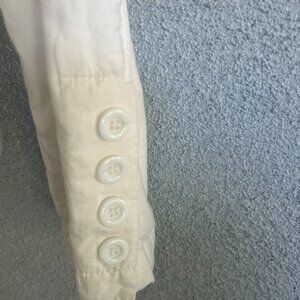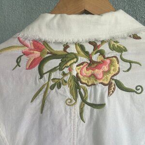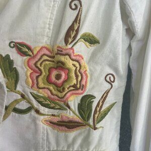 Embroidered front and back. Raw edge collar. Two front pockets. Four buttons on cuffs. Notched back. In good used condition. Size M, but runs small. See sizes.