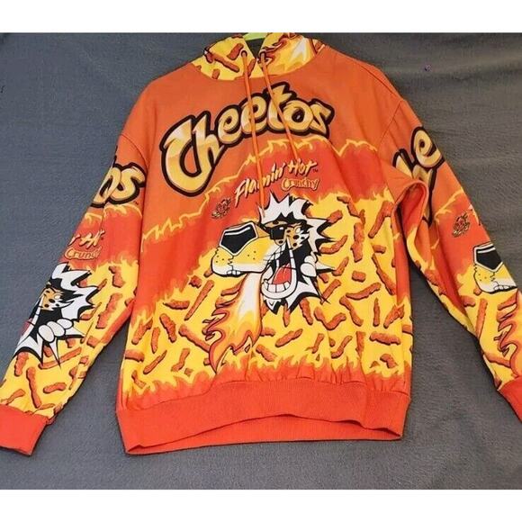 Flamin Hot Cheetos Chester Cheetah S Hoodie All Over Print Sweatshirt Pullover. 100% Polyester. Front pockets. Excellent used condition no stains or holes. Smoke-free home. Check out my other items I will combine shipping