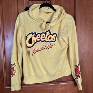 Flamin Hot Cheetos Yellow Hoodie Womens Oversized Size Small Slightly Cropped. Hoodie is a size small but is a little looser fit. It sits right at the hips. See measurements in photos. Small mark on back shown in photos. Front of hoodie and sleeves have details, back of hoodie is plain.