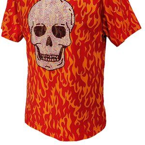 Super-hot design vintage men's t-shirt, flaming-red fabric with a premium crystal skull hotfix motif, the roof is on fire!