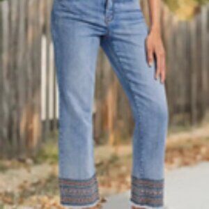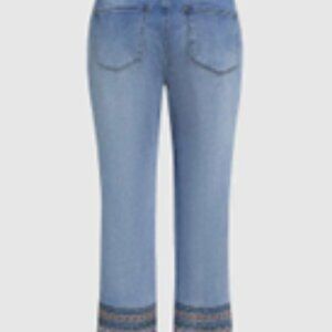 Light blue crop Jeans raw hem, mid rise, straight leg with wash embroidery print at the bottom of the legs. Size L (10/12). New with Tags!