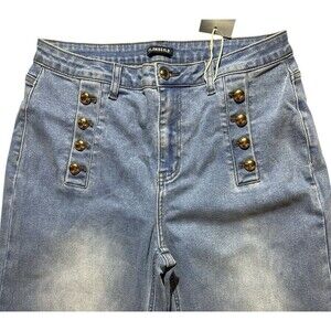 Often described as "sailor jeans" or "mariner jeans" with the front pocket gold-toned buttons being the prominent feature, appearing as double breasted style on the high waist.