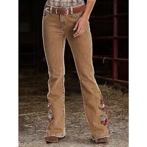 Flamingals Women's Floral Embroidery Mid Waist High Stretch Bootcut Jeans XL