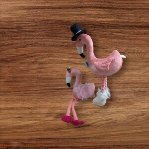 These flamingos are dressed to impress. One's ready to walk down the aisle in a chic tulle dress, while the other rocks a dapper top hat.