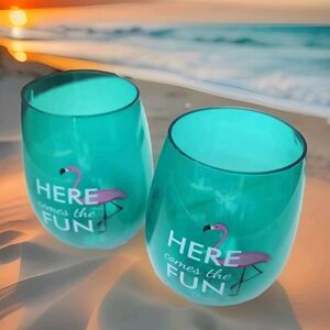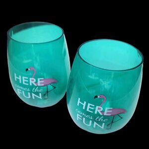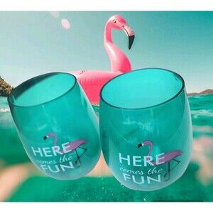 This set of two stemless wine glasses features a fun and unique design of two flamingos in a teal color, perfect for any beach or pool party. Made of durable acrylic material, these glasses are decorated with a novelty pattern "Here Comes the Fun" and Flamingo, and are dishwasher safe for easy cleaning.