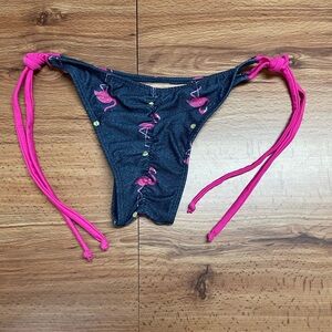 Bikini bottom with side tie. Also has ruched back which helps create a bubble-butt illusion, enhancing your bootie’s curves. Bikini bottom is lined in the front and back. Flamingo & denim print