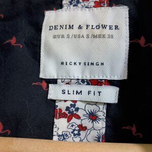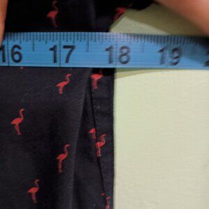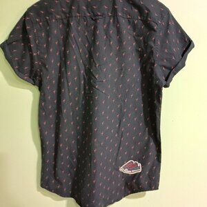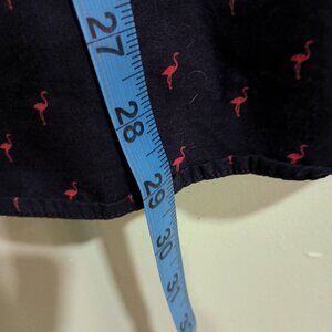 Navy blue button down with pink flamingo pattern. Matching shoe patch on back and sewn in cuff sleeves. Measurements and fabric content in pictures.