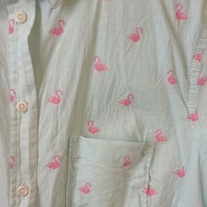Light blue button up collared shirt with pink flamingo pattern. Small pocket on one side. NOT sheer.