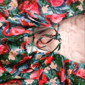 Vibrant swimsuit with flamingo print and ruffled shoulders. Perfect for a tropical, beach getaway.