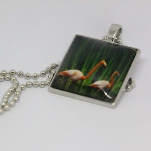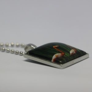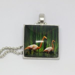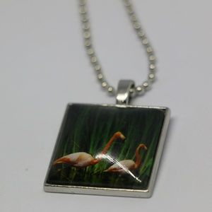 Flamingo Silver Plate & Glass Cabochon Pendant with stainless steel ball chain.