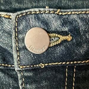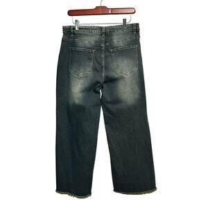 These Flamingo Shop jeans are a women's L size in a straight, wide leg style with a regular fit. They are distressed, dark-washed blue, and feature a mid-waisted design with a raw hem. Made from a blend of cotton, polyester, viscose, and spandex, they offer comfort and flexibility. The jeans have a button and zip closure and are manufactured in China. Although pre-owned, they are like new, never worn, and come from a smoke-free home. Measurements are available in the pictures. Slight irregularities in the hem at the zipper. Never been worn so it it is an irregularity, it happened in production. Thanks for checking them out!