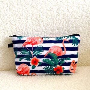 Blue and white striped pouch with flamingo and palm leaf pattern. Zippered closure. Approximately 8.2x5.3".