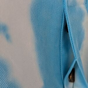 Excellent preowned condition aqua blue and white tie dye bib overalls from Flan Labs. Amazing statement piece from Brooklyn, NY streetwear designer. Hand tie-dyed so no piece looks the same. Great trademark saying hand painted on straps and down leg. "Forever Laughing at Nothing." Tons of pockets and logo studs. Heavy cotton, serious overalls. Button fly. No flaws.