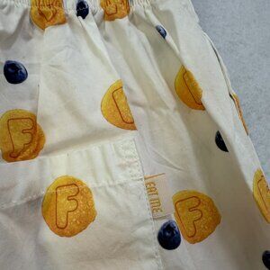 Fun novelty shorts featuring yellow pancake print with 'F' motif and blueberries throughout