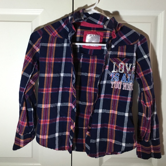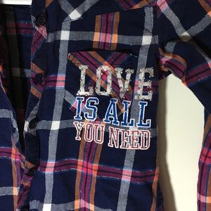 Navy blue with multi color flannel. "Love is all you need" embroidered on the pocket. Size 8 in children