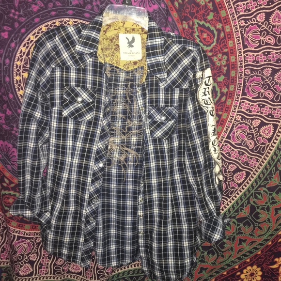 Blue and black plaid flannel with design and rhinestones on the back
