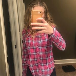 Pink flannel! Super cute and comfy! Only worn a few times, still in good condition! It’s a large in kids size but can fit a women’s S or xs