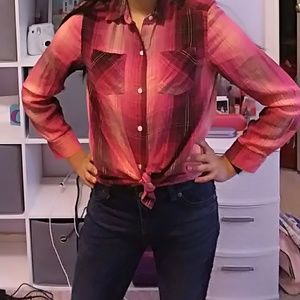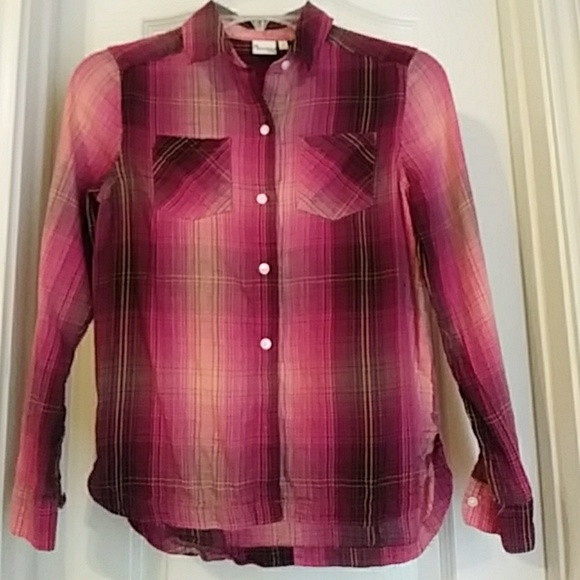 Magenta & Salmon colored pattern flannel with white buttons. (Gently Used)