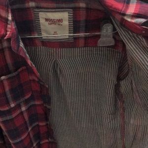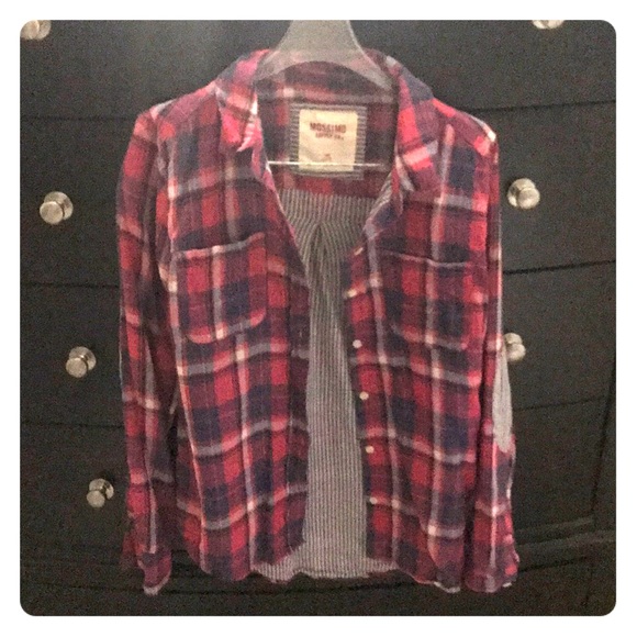 Blue red and white flannel with striped elbow patches and lining
