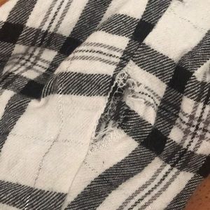 Flannel shirt Blk and white with some silver strands in it Small hole — quarter size — on back wrist on one sleeve.