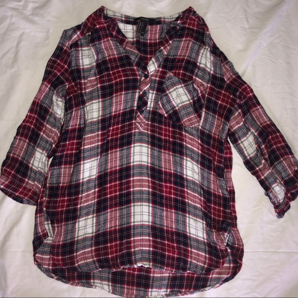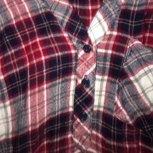 Adorable blue/red/grey/white flannel half up button. Would look perfect with a pair of jeans!