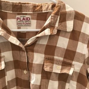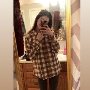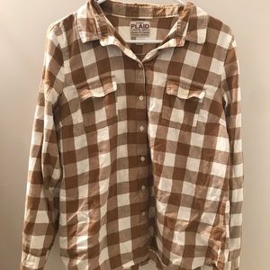 Beige and white flannel - size large but it fits me perfectly as a small (but I enjoy loose flannels) - worn maybe twice